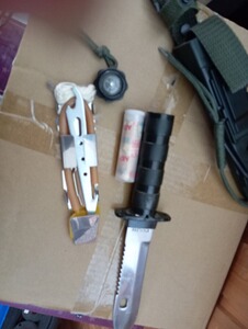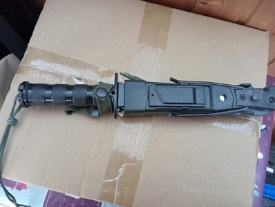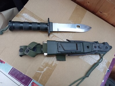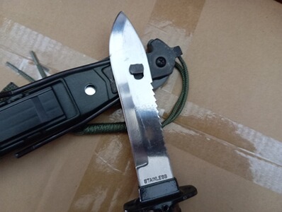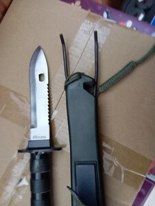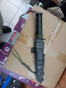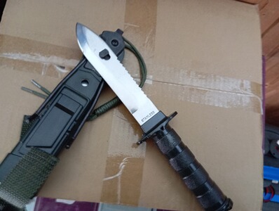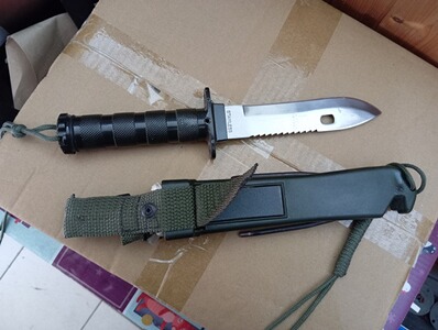 Geschwärzte, 5 mm starke Klinge aus rostfreiem Edelstahl mit scharfer Säge auf dem Rücken. Heft und Klappe sind aus rostfreiem Stahl (antimagnetisch) mit Hohlraum. An der Verschlusskappe ist ein Kompass und eine Sicherheitsschnur zur Hangelenkbefestigung angebracht. In einen zusätzlichen Fach der Scheide ist ein Beimesser untergebracht, das "Skinner ", mit einer Länge von ca. 12,5 cm und einer Stärke von ca. 2 mm.