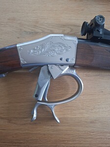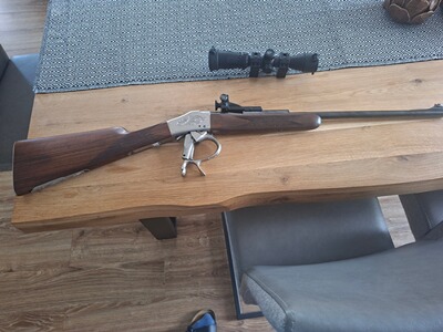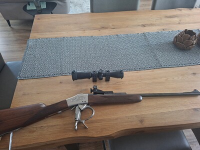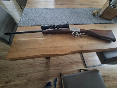 Wegen Bestandsreduzierung aus Altersgründen und auch gesundheitlich trenne ich mich von dieser Waffe. Dieses einmalige Belgien Comblain Waffe in .45 Long Colt wurde von einem Büchsenmacher gebaut. Der Zustand ist sehr gut, nur minimale Gebrauchsspuren am Schaft. Die Metallteile und das Laufinnere sind makellos. Der Verschlussrahmen, der Abzugbügel und das Schaftmagazin sind mit floralen Gravuren verziert. Die Lauflänge beträgt 58 cm, die Schaftlänge bis Abzug 36,5 cm. In das Schaftmagazin passen vier Partronen. Das Zielfernrohr trägt die Zeichen UTG, es ist vergrößer bar von 2- bis 7-fach und hat ein beleuchtetes Absehen. Zielfernrohr und Montage sind neu und Bestandteil der Auktion. Diese individuelle Waffe ist ein Einzelstück und keine von der Stange.Da ich die Waffe bei einen Büchsenmacher hatte und er einen Haarriss im Fallblock feststellte wurde sie Fachgerechtvon einem Büchsenmacher Repariert und alles neu eingepasst .Sie wurde in Suhl Beschussamt neu Beschossen also sie ist wieder wie Neu Reparatur 400€ wird auch mit Rechnung belegt diese schicke ich auch mit .Wegen schlechter Erfahrung werden Bieter aus dem Ausland nicht berücksichtigt, nur innerhalb Deutschland. Da Privatauktion keine Garantie und Rücknahme. Kann abgeholt oder verschickt werden der Käufer zahlt den Versand