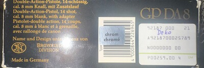 Browning 8 mm Schreckschuss mit PTB 389/2 aus 1992 aus Nachlass eines Sammlers in OVP Die Pitole ist Verchromt und das Magzin fasst 14 Patronen