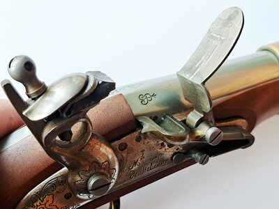 Es handelt sich um eine reine DEKO Waffe, denn: Der Lauf hat KEINE durchgängige Zündlochbohrung (nur angedeutet) und im Pulversack wurde, durch den Lauf eingeführt, wohl ein Bolzen (messingfarben) eingepresst.