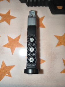 Eine wirklich einzigartige CO₂-Pistole, die auffällt. Das liegt zum einen an den Sichtfenstern im schweren Verschluss. Durch diese kann man den messingfarbigen Lauf sehen, der im übrigen ein Laufgewinde für einen Schalldämpfer besitzt. Völlig neuartig ist jedoch das herausnehmbare Magazin, das sowohl die CO₂-Kapsel trägt wie auch als Halter für die drei beiliegenden Ersatz-Laderinge dient. Sowohl Diabolos wie auch BBs lassen sich verschießen, sogar gemischt. Durch den Metallschlitten wird fast ein Kilo Gewicht erreicht.