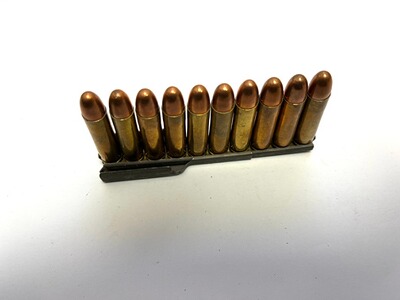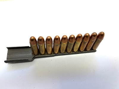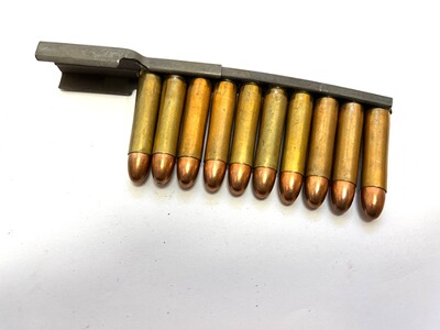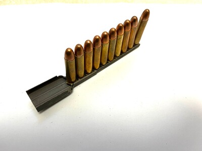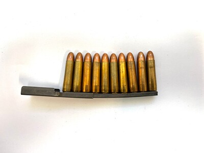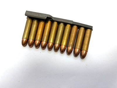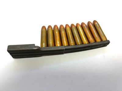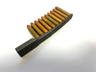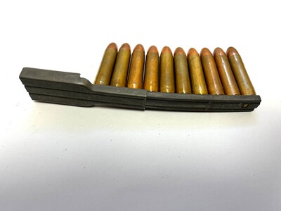 Im Angebot ist ein originaler Ladestreifen mit Ladehilfe für das US Selbstladegewehr M1 Carbine im Kaliber .30 Carbine inklusive 10 Dekopatronen.