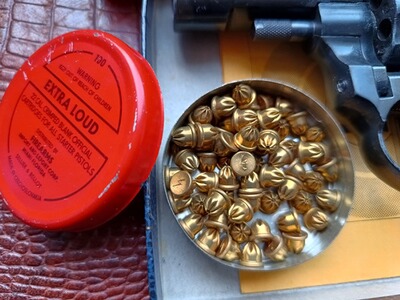 Made in West Germany. Dabei etwa halbe Dose von passender Munition, aus ca. 1980er Jahren. Made in Czechoslovakia von S&B.