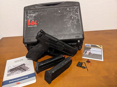Heckler & Koch SFP9 im Kaliber 9x19 mit 2 Magazinen und original Zubehör (Koffer, Griffschalen, usw.). Die Visierung wurde durch ein LPA Visier getausch (Original wird mitgeliefert). Die großen Griffschalen wurden mit Korund beschichtet (besserer Grip).