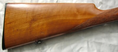 Gerade engl. Holzschäftung mit schöner Maserung, ohne Backe, ohne erkennbare Schränkung, dünne Kunststoffschaftkappe, Sicherungsschieber auf dem Kolbenhals. Vorderschaft und Kolbenhals mit scharf geschnittener, deutscher Fischhaut. Für Li.- und Rechtsschützen geeignet.