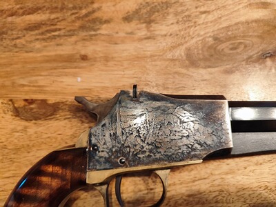 Einschüssige Perkussions-Pistole neuer Bauart, mit verstellbarer Visierung, 18 mm Achtkantlauf, mit hoher Eigenpräzision, gültiger SP-Beschuss, Stahlsystem mit Walzgravur (Motiv wagentreck unnd Jagdszene), anschließend bunt gehärtet, Messing-Griffstück mit Holzgriffschalen.