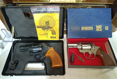 Hier kommen meine schönen RG 69 N zum Verkauf im Schwarz & Nikel die beiden Revolver sind im guten Zustand keine Macken Kratzer . Der schwarze Revolver hat den Beschuss AH/2007 PTB 594 & die silberne hat den Beschuss AI/2008 PTB 594. Die 1 Beschreibung ist von einem RG 69 mit PTB 275, die Beiden Revolver haben einen Abschussbecher, Bürste & Koffer/Karton. Bilder gehören zum Angebot.