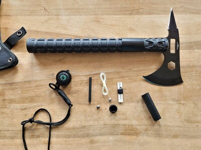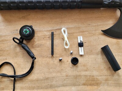 Die Endkappe des Griffes mit Kompass ist abschraubbar. Im Hohlgriff sind diverse Survivalutensilien (2x Angelhaken, Faden, Nadel, Angelschnur, Angelblei, Feuerstahl) eingelegt.