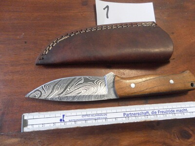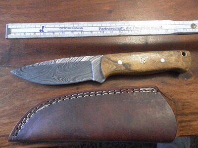 Ich verkaufe aus meiner Sammlung ein schönes und absolut neuwertiges Jagd - oder Campingmesser. Es besteht aus 1095&15N20 er Stahl und ist handgeschmiedet. Es ist Gesamt 20,5 cmm lang und die Klinge beträgt 10,5 cm. Der Griff besteht aus ( Oliven? )Holz. Dazu gehört eine Lederscheide.