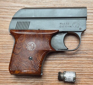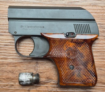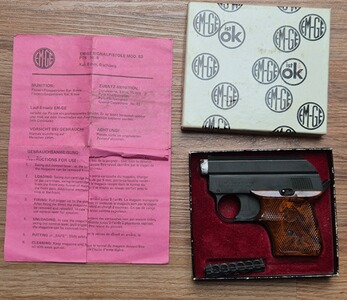 Gas-Signal-Pistole aus dem Hause EM-GE. Mit Magazin und Anleitung (ein einer Stelle ist die Anleitung eingerissen). Voll Funktionsfähig. Für das Alter der Pistole finde ich sie noch sehr schön erhalten, beurteilen Sie selbst anhand der Bilder. Pistole ist leicht gebraucht, aber keineswegs verbraucht. Die Pistole ist mehrer Jahrzehnte alt, dies bitte berücksichtigen.