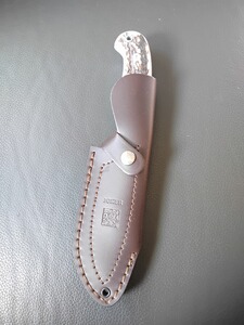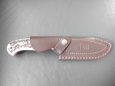Hubertus Hirschhorn Jagdmesser aus meiner Sammlung, 1.4116 Stahl. Durchgehende Klinge, Edelstahl Backen. Fangriemen Öse. Inkl Sattelleder Scheide.