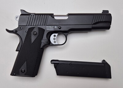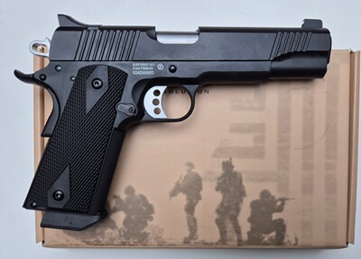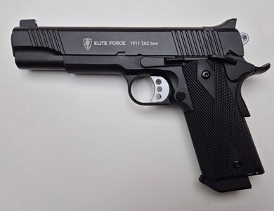 Elite Force 1911 Tac two Gas Blowback (GBB) Pistole im Kaliber 6mm. Eine moderne Interpretation der ikonischen 1911. "Vollmetal" laut Handelsbeschreibung. Griffschalen aus Kunststoff.
