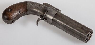 Aus einem Nachlass, verkaufe ich einen historischen Revolver, auch Pepperbox genannt mit Verzierungen und Holzgriff. Der Lauf ist Drehbar. Hierbei handelt es sich vermutlich um einen Deko-Revolver der keinen Eintrag in eine Waffenbesitzkarte benötigt (Auskunft der Polizei Berlin). Ein Bügel um den Abzug ist nicht vorhanden. Gewicht ca. 600g, Länge 18cm. Privatverkauf ohne Rücknahme und Garantie, alle Angaben nach bestem Wissen und Gewissen. Versand per DHL Paket versichert nur in Deutschland,