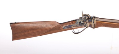 Die berühmte Fallblockbüchse Sharps 1863 aus der amerikanischen Bürgerkriegszeit. Hochwertige Präzisionsfertigung aus dem Hause Davide Pedersoli. Systemkasten buntgehärtet, bräunierter Achtkantlauf, weitere Stahlteile schwarz brüniert. Höhenverstellbare Kimme, seitlich verschiebbares Korn. Einstellbarer Stecherabzug, hochwertiger Nußbaumschaft.