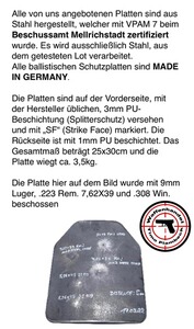Alle von uns angebotenen Platten sind aus Stahl hergestellt, welcher mit VPAM 7 beim Beschussamt Mellrichstadt zertifiziert wurde.