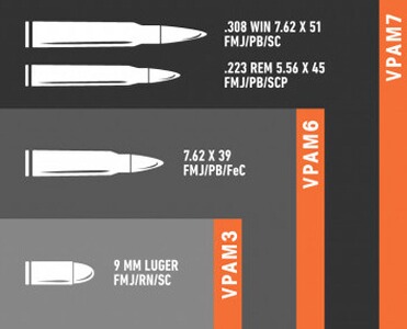 Die VPAM7 bietet Schutz vor den aktuell häufigsten westlichen Sturmgewehrmunitionstypen, welche aus reinem PE oder einer UHMW-PE Lösung bestehen.