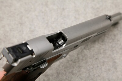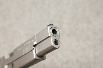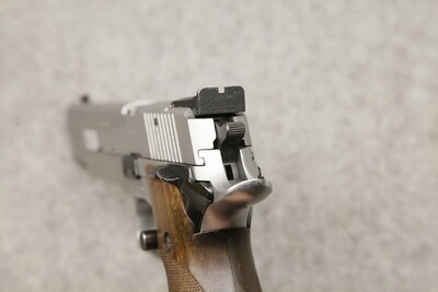 Kaliber 9 mm Luger. Lauflänge 6", langer Verschluß, schweres Griffstück, Sportabzug mit Triggerstop, Abzugsgewicht individuell verstellbar. Beidseitige Sicherung. Lang geschwungenes BeaverTail und Abzugsbügel mit Undercut für eine hervorragende Handlage. Tiefer liegende Laufseele. Magazin mit dickem Alu-Boden, Magazinkapazität 19 Patronen.