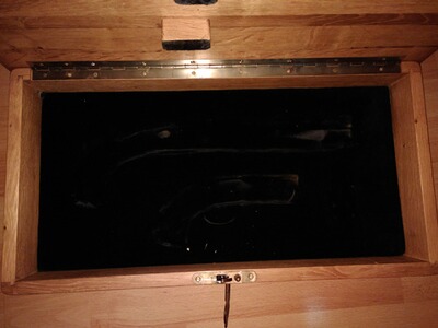 Massive, schwere und abschließbare Präsentationskassette für zwei VL-Pistolen (Kentucky-Pistole und Philadelphia Derringer) gemäß Fotos. Abmessungen 51 x 26,5 x 11cm. Keine Rücknahme und/oder Garantie.