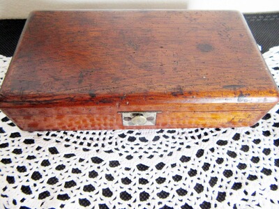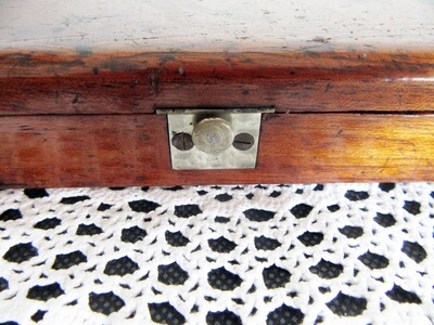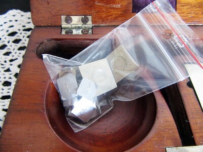 Kleine und bezaubernde Biedermeier Apothekerwaage in einer Kirschbaum-Schatulle. Rechteckiges Gehäuse, innenliegend eine aus Messing gefertigte Balkenwaage, zwei Bakalit-Schalen sowie eine Pinzette und mehrere Gewichte. Der Haltegriff der Waage weist etliche Eichpunzierungen auf. Der Balken ist mit der Herstellerpunze „21 D*R 14“ versehen. Die Haltebänder der Schalen sind nicht Original. Schalen weisen eine charmante Gebrauchspatina auf. Eine der Schalen hat einen Riss. Zur Apotherkerwaage gehört noch ein Konvolut von kleinen Gewichten. Ich gebe keine Garantie auf Vollständigkeit, Funktionsfähigkeit und dass alle Teile original zur Box gehören.