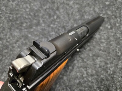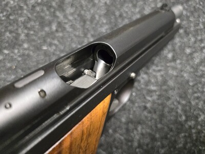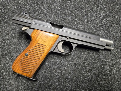 Zu diesem Klassiker muss man eigentlich nichts sagen. Toppräzise, hervorragender Abzug, eine feine Visierung, mit der Waffe kann man seit Jahrzehnten gewinnen. Gerade in Dienstpistolendisziplinen wie BdMP DP1 kommt man schwer an ihr vorbei. Die vorliegende stellt dennoch eine Besonder- und Seltenheit dar: Aufgrund der großen Nachfrage und dem nicht immer sehr guten Zustand der wohl 5021 gebauten Waffen gab es den Wunsch, die Waffe neu aufzulegen. Die Firma Frankonia Jagd (Würzburg) bestellte 1995 bei SIG eine Serie der SIG P210-4, welche die Nummern D 6001 bis D 6500 erhielten. Die Waffen waren mit Holzgriffschalen ausgestattet. Insbesondere erhielten sie den Ladestandsanzeiger, der auf der Oberseite des Verschlusses angeordnet ist und anzeigt, ob sich eine Patrone im Patronenlager befindet. Die Waffe aus der original Schweizer SIG-Fertigung ist nach meiner Beobachtung sauberer verarbeitet, als die Waffen aus den 50ern, die Oberflächen vor allem innen deutlich besser und auch der bekannte Unterschied zwischen der Brünierung von Verschluss und Griffstück ist hier nicht gegeben. Als Besonderheit ist die Visiserung etwas weniger filigran, wie es bei den späteren SIG üblich ist, für Schützen besser aufzunehmen. Der Zustand der Waffe ist hervorragend, die Bilder vermitteln einen guten Eindruck. Wenn man unsbedingt ein Haar in der Suppe suchen will: seitlich am Hahn gibt es einige kleine Fleckchen, welche ich nochmals im Detail abbilde. Natürlich ist der Lauf blitzblank und scharfkantig, die Holzgriffschalen sind wunderschön. Die Pistole kann nach Absprache in Leipzig begutachtet und u.U. auch zur Probe geschossen werden, gern ist unter Wegfall der Versandkosten auch eine Abholung möglich. Kunden aus dem Ausland sind natürlich willkommen, wenn Sie den Import/Export über einen deutschen Händler abwickeln (zum Beispiel Waffen Bock in Pirmasens). Bitte beachten Sie auch meine hochwertigen Angebote bei Auctronia (https://www.auctronia.de/suche?searchcategory=&q=leipzigerzeugwart) sowie immer wieder auch bei www.egun.de (in der Detailsuche „nur Artikel von Benutzer“ den Suchbegriff „leipzigerzeugwart“ eingeben).