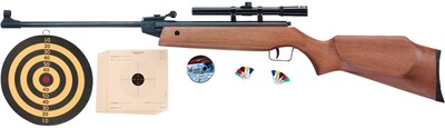Ein zuverlässiges, preisgünstiges und robustes Sportluftgewehr. Mitt Kipplauf-Federdrucksystem, gezogenem Lauf, Mikrometervisierung und Korntunnel, im Set mit 500 Diabolos, 10 Federbolzen, 20 Zielscheiben, 1 Dartscheibe und 1 Zielfernrohr 4 x 15.