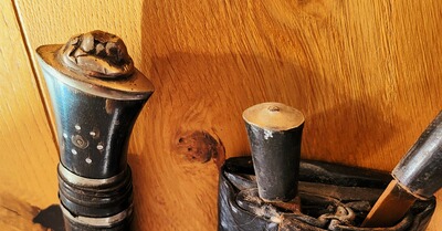 mit Metallabschluss, 2 kleine Messer in der Scheide, Zustand gebraucht, siehe Fotos, Größe siehe Abmessung Zollstock