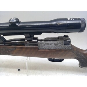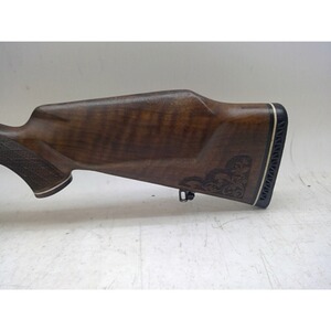 Waffe brüniert mit hellem Schlitten, Goldeinlage im Kammerstengel und im Schlösschen, Edelholzabschluss am Vorderschaft und Pistolengriff, deutscher Stecher, Riemenbügel, Monte Carlo Rücken und Backe, ventilierte Gummischaftkappe