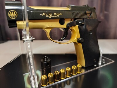 Gefragte Sammler Pistole,ist die einzige die Revolver Munition Kaliber 9mm R.K Verschießen kann und ist dadurch sehr laut.