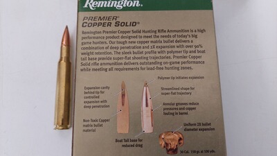 Verkaufe 200 Schuss Remington Premier Copper Solid .30-06 Spring. bleifrei mit 165gr. Geschoss nach Kaliberwechsel. Das Geschoss ist laut div. Testberichten mit dem GMX Geschossaufbau vergleichbar. Die Remington Premier Munition hat bekanntlich ein hohes Präzisionspotential.