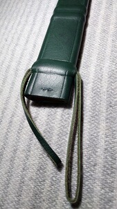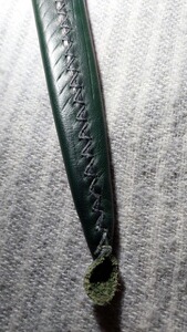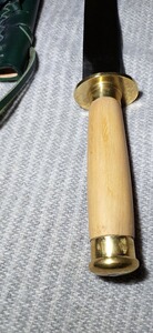 Der helle Holzgriff ist etwa 10 cm lang, mit einem scheibenförmigen Messingparier und einer ebenfalls mit der Klinge vernieteten Messingkappe ausgestattet. Dieses leichte und schnelle Messer wiegt nur 325 Gramm und besticht durch seine ausgeglichene Balance. Die verzierte grüne Lederscheide mit Trageschlaufen rundet das Gesamtbild elegant ab.
