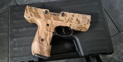 Zoraki 925 Schreckschuss Waffe mit Metallschalldämpfer, kleinem und großem Magazin. Die Guntapes können bei Bedarf rückstandslos entfernt werden.