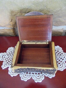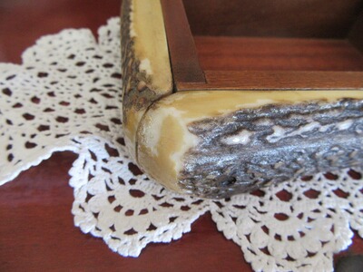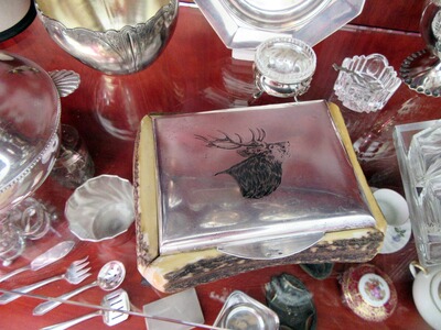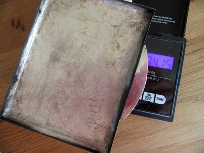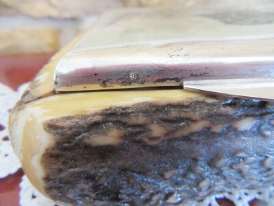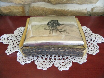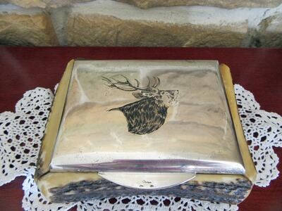Alter Zigarettenspender mit 900er Silbermontur. Zedernholz Schatulle die seitlich mit Hirschhorn verkleidet ist. Das Horn war ursprünlglich mal mit einer Schutzlasur beschichtet die sich an den Kanten löst. Der Flache Deckel ist mit einer 900er Silbermontur versehen und weist mittig einen gravierten Hirschkopf auf. Auf der Innenseite der Montur wurde etwas hereingeritz was vielleicht Berlin 44 …. bedeuten soll. Der kleine Handhaben der Montur weist zwei mal die Punze FP 900 sowie einen Sc hriftzug auf. Ein Hersteller kann nicht benannt werden. Das einzigartige Stück weist eine dem Alter entsprechende charmante Gebrauchspatina auf. Die Montur sollte neu aufpoliert werden.