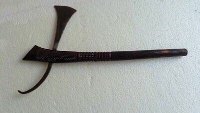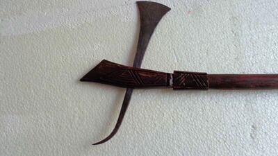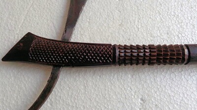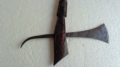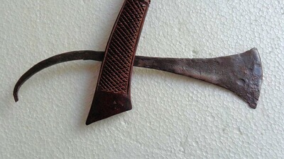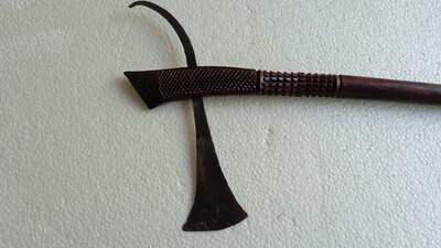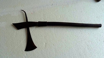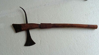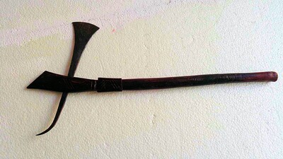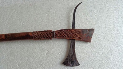 Im Fundus einer Militaria Sammlungsauflösung befanden sich auch handgefertigte Streitäxte nach historischem Vorbild. Axtblätter mit "Enterhaken" sind handgeschmiedet, Holzstiele mit Schnitzereien versehen. Welche Bevölkerungsgruppe mit derartigen Waffen einst kämpfte - sicherlich noch stabiler und wuchtiger gefertigt - ist mir nicht bekannt. Es sind 3 Objekte in etwas unterschiedlicher Gestaltung und geringem Erhaltsunterschied - von exzellent bis gut. Die Längen sind 38, 45 und 48 cm.