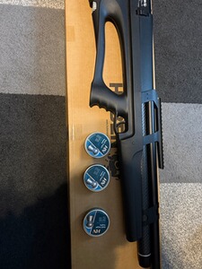 Ein Huben K1 5,5 mm Pressluftgewehr mit 750 SchussField Target Trophy.Das Pressluftgewehr ist in einen absolut neuwertigen Zustand.19 Schuss Magazin,intengrieter Schalldämpfer,Ersatzteilsatz