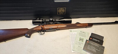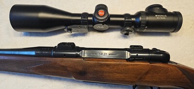 Sehr gepflegte Heym SR21 im Kaliber 8×57 IS, geliefert im Komplettpaket mit Leica Magnus 2,4–16×56i, original Heym-Schwenkmontage, Heym Waffenkoffer sowie 3-Schuss Magazin.
