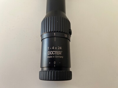 Das Docter Unipoint 1-4 x 24 ist mit einer Ziess Innenschiene ausgestattet und wird mit einer Blaser Sattelmontage geliefert. Es wurde ursprünglich als Zweitglas auf einer R93 montiert und eingeschossen, jedoch nie aktiv genutzt. Das Glas eignet sich besonders für die Drückjagd.