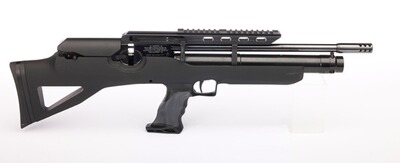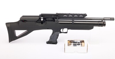 Kurze Bullpup-Version mit vorverlegtem Repetierhebel. Ohne Visierung, Picatinny-Schiene für Zielfernrohr-Montage, Mündungskompensator. Einstellbarer Abzug, schwarzer Kunststoffschaft für Rechts- und Linkshänder mit Soft-Touch-Finish und verstellbarer Schaftkappe. Gesamtlänge: 69 cm, Gewicht: 3,8 kg. Kartusche 10.2025.