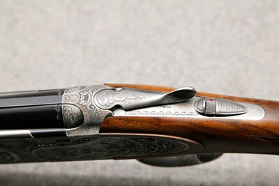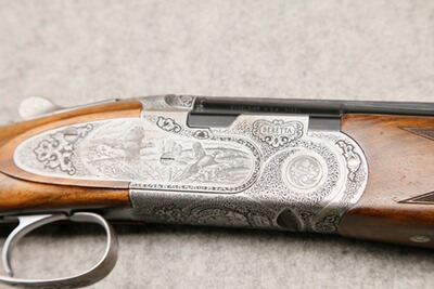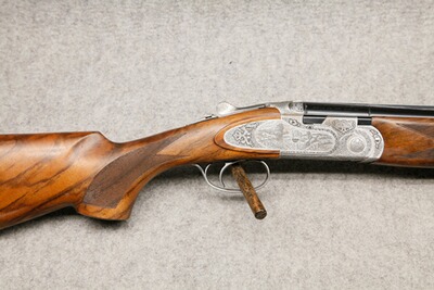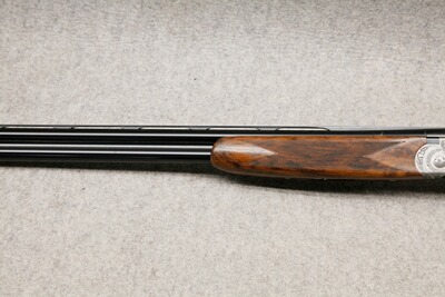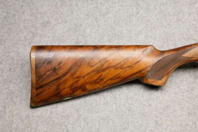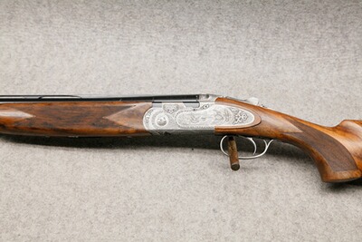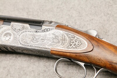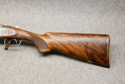 Kaliber 20/76, Lauflänge 71 cm, ventilierte 6 mm Laufschiene. OCHP Wechselchoke, inkl. 5 Chokeeinsätze und Chokeschlüssel. Elegant geformte Basküle, lange Seitenplatten mit Flugwildgravur, umrahmt von feinen Arabesken. Einabzug mit Umschaltung, Schiebesicherung. Gerader Schaft mit Pistolengriff, Fischhaut, ohne Backe. Wechselbare Holz- und Gummischaftkappe.