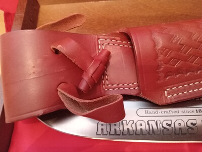 Die Scheide ist sehr aufwändig aus dickem bestens vernähtem Sattelleder.
