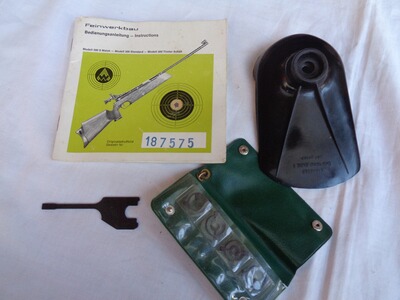 Zu dem Gewehr gehört die original Gebrauchsanweisung inklusive dem Testschussbild ab Werk, die original Diopterblende (Strasser Modell II) und das original Set mit Wartungs-/Verstellschlüssel inklusive 4 verschiedenen Korneinlagen (2x Ring- & 2x Balkenkorn) in der original Kunststofftasche.
