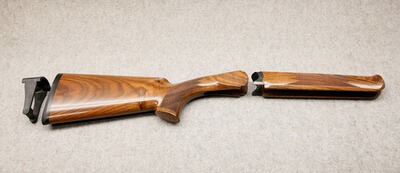 Vorder- und Hinterschaft für Blaser F3 Sporting. Feine Fischhaut, 1 mm. Vorderschaft mit Tropfnase. Sporting Hinterschaft, Senkung 40 / 55. Hinterschaft-Balancer, Schaftlänge 370 mm. Schaftholzklasse 6.
