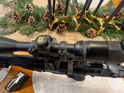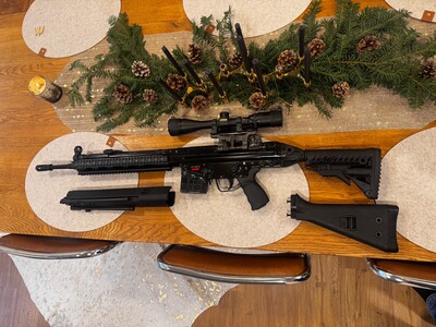 Die Waffe ist mit einem Standard-Handgriff und Schulterstütze ausgestattet. Darüber hinaus ist ein Picatinny Handschutz sowie eine verstellbare Schulterstütze montiert. Ein hochwertiges Nikon Zielfernrohr mit 2,5 - 10 x 45 kann nach Belieben montiert oder demontiert werden.
