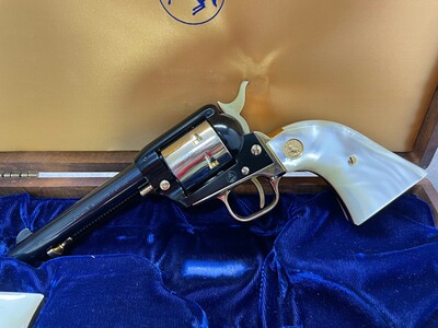 Dieses Set umfasst zwei Waffentypen: den S.A.A. und den "K"-frame Scout. Die angebotenen Kaliber sind .45 Colt und .22lr. Die Lauflänge des Scout beträgt 4 3/4 Zoll, während der S.A.A. eine Lauflänge von 5 1/2 Zoll aufweist. Beide Modelle verfügen über ungeflutete Trommeln und Griffschalen aus Perlmuttimitat, die mit einem vergoldeten Colt-Emblem verziert sind. Die Laufbeschriftung weist auf die limitierte Produktion von nur 100 Stück hin.