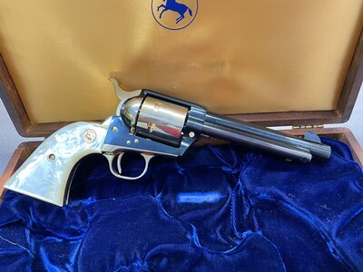 - Griffschalen: Perlmuttimitat mit vergoldetem Colt-Emblem