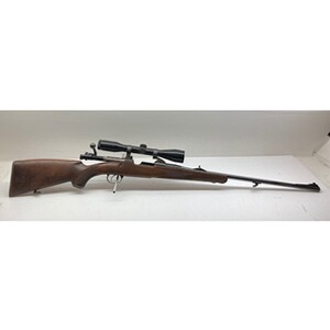 98er Repetierbüchse im Kaliber .243 Win. Kombiabzug mit Rückstecher. Schaftmaß 35cm mit deutscher Backe. Lauflänge 60cm. Flügelsicherung auf 2 stellige Variante modifiziert. Der Schaft weist diverse Gebrauchsspuren auf.