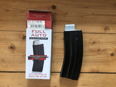 Ein zweites Magazin habe ich nachgekauft, da das erste undicht geworden ist und ich einen Vorrat haben wollte, sobald die Produktion eingestellt wird. Würde ich das Gewehr behalten, würde ich die Dichtung dieses Magazins am Auslass wechseln, damit es wieder dicht wird. Bei diesem Magazin fehlt der Innensechskant, der ab Werk als Werkzeug zum Eindrehen der Co2-Kapseln im Magazin selbst gelagert werden kann. Es handelt sich um einen handelsüblichen Innensechskant und dieser kann entweder nachgekauft werden oder der des anderen Magazins verwendet werden. Dieses undichte Magazin gebe ich gratis dazu. Neupreis: 109,- Euro.