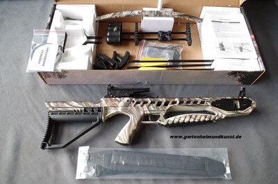 Verkaufe eine tolle tarnfarbene Rip Claw Armbrust mit 175 lbs Zuggewicht Ausstattung mit Schulterstütze inklusive 4 Pfeilen / bzw Bolzen , Sehnenwachse ,Tragegurt , Beschreibung in Englisch mit Abbildungen ! Es handelt sich um unser Muster , es war für die Fotos und zur Ausstellung aufgebaut , wurde jedoch noch nie beschossen ! Kleine Spuren sichtbar bei genauen Hinsehen und es wird genau das mit dem Karton abgebildete versendet !