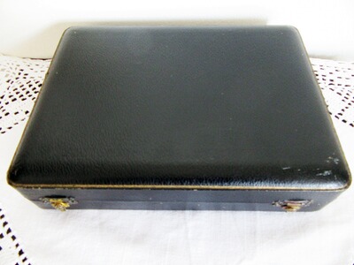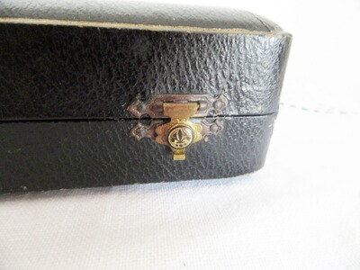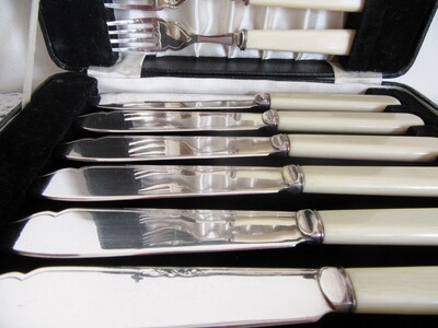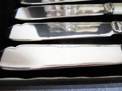 Verspieltes altes, versilbertes Fischbesteck aus England. Die jeweiligen Handhaben des Besteck sind aus Knochen oder Faux Bone (Knochenimitat) ? gefertigt. Die Klinge des Fischmesser ist mit einer einseitigen, feinen und zarten Ziselierung im Klingenverlauf sowie mit einer Herstellerpunze versehen. Das Schiff der Kelle ist mit einer zarten Girlanden-Ornamentik versehen. Zu dem antiken Set gehört der original mit Leder bezogener Besteckkasten dazu. Der Innenteil der Box ist mit blauen Samt ausgeschlagen. Für die Gabeln gibt es eine verschließbare Halterung, damit die Gabeln nicht beim zusammenklappen des Besteckkasten herausfallen. Die Verschlüsse des Besteckkasten weisen die französische Lilie auf. Alle Besteckteile sind in einem fast neuwertigen Zustand und haben fast keine Polierspuren. Lediglich die Handhaben weisen ein dem Alter entsprechendes Spaltmaß zu Klingen- bzw. Kellenansatz auf. Die Punzenreihe des Herstellers konnten leider nicht aufgeschlüsselt werden. Ich habe noch ein englisches Vorlegebesteck mit ähnlichem Dekor eingestellt.
