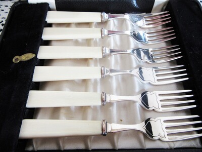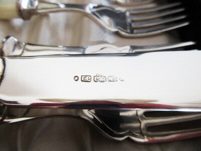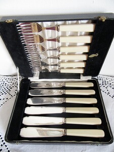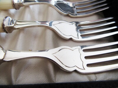 Das schöne Besteck muss ggf. neu poliert werden. Sie bieten nur auf das Fischbesteck nicht auf andere auf den Fotos zu sehende Antiquitäten.