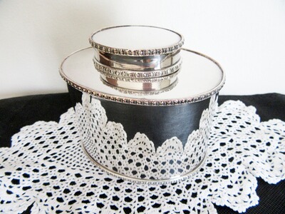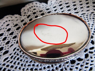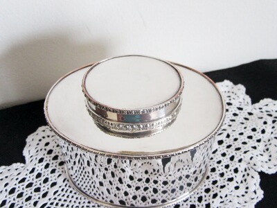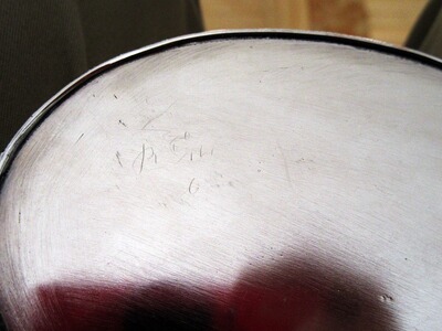 Elegante, versilberte Teedose, im typisch englischen Stil der 20er / 30er Jahre. Ovale glatte Wandung, abgesetzte Schulter mit Stülpdeckel. An den Rändern von einem dekorativen Perlband im Halbrelief umzogen. Auf dem Boden eine Herstellergravur. Auf einer Seite befindet sich im oberen Bereich eine ganz kleine Beule (Siehe Foto mit rotem Kreis). Der Stülpdeckel weist mittig eine leichte Beschädigung auf (Abrieb ? Siehe Foto). Die Teedose weist eine dem Alter entsprechende charmante Gebrauchspatina auf.